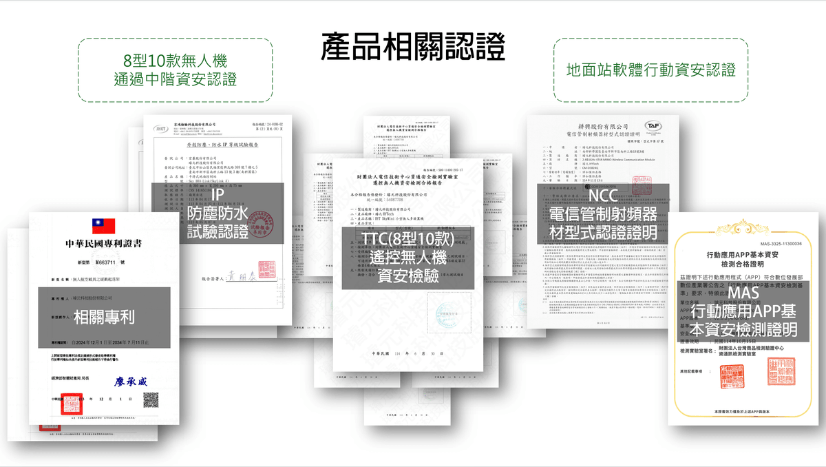 - 第一家通過無人機資安檢測,共4型6款無人機取得TTC中階資安認證。